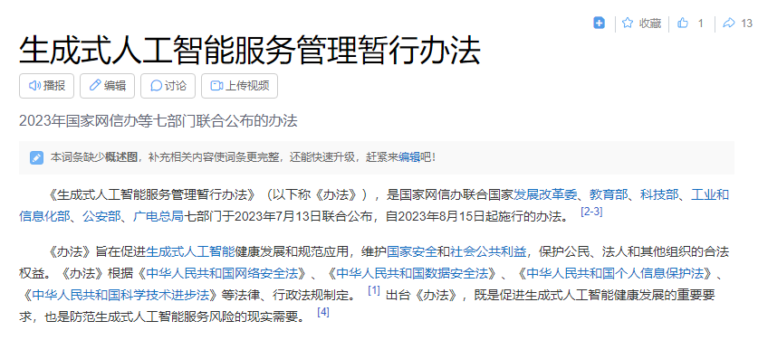 要理解这个问题,我们需要看一下我国最近发布并实施的《生成式人工智能服务管理暂行办法》。